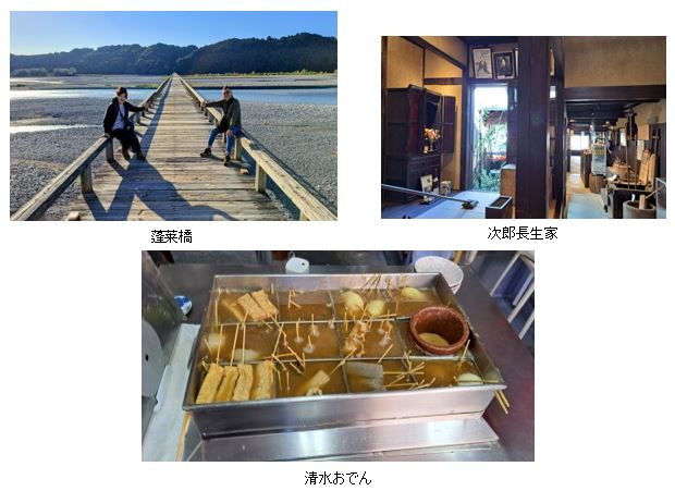 くれたけイン焼津駅前⇒蓬莱橋(8:00)⇒小泉八雲記念館(9:40)⇒小川港(12:00)⇒次郎長生家(13:00)⇒柏(19:00)