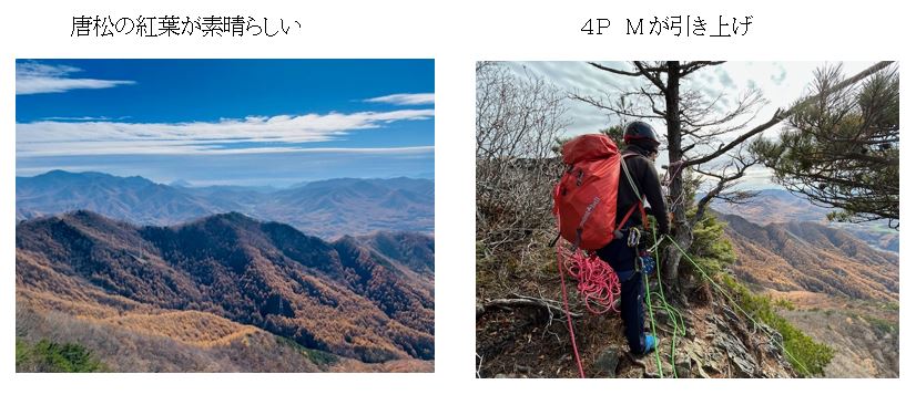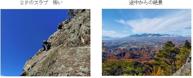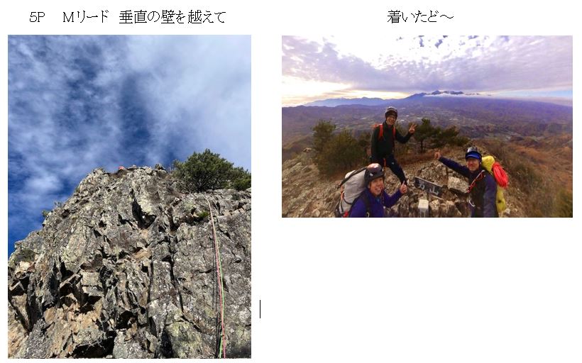 1PをKがリードでトライするも支点を取れるところが全くなく途中敗退、Aが代わりに登る。2P、3PもそのままAがリード。4P、5PはMリード。最終ピッチの5mの垂直の壁が今回の核心と言われていたが、Mは苦労せずクリアしていった。感覚としては1Pが支点なく恐怖感があり、2Pのスラブの壁も見た目以上に立っていてかなり緊張した。