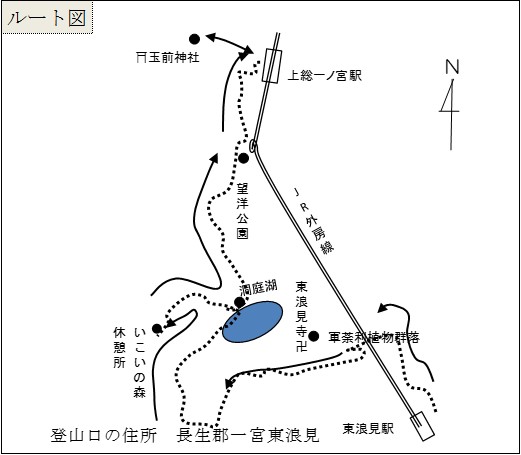 東武柏5:59⇒船橋⇒7:03千葉駅7:10⇒7:57上総一ノ宮8:03⇒8:07東浪見駅8:15→8:39軍荼利山東浪見寺→8:56軍荼利山9:05→10:20洞庭湖→10:30いこいの森休憩所(WC、昼食)洞庭湖散策11:00→12:40望洋公園→13:00上総一ノ宮駅(解散)13:05→玉前神社13:35→13:55上総一ノ宮駅15:09千葉15:24⇒15:45船橋15:58⇒16:27東武柏
