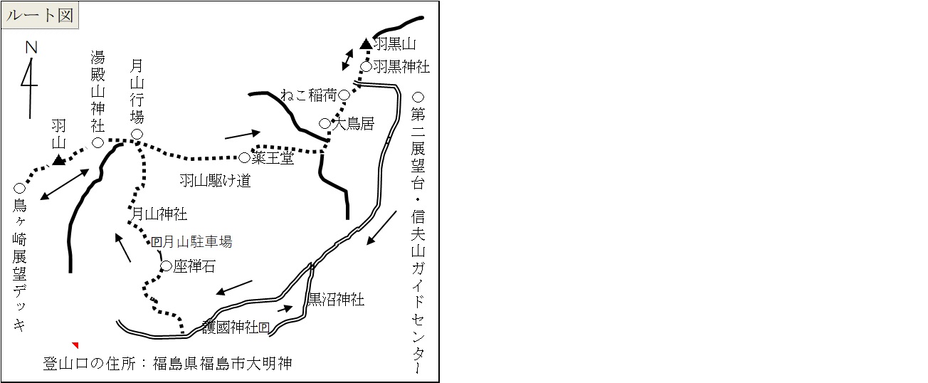 護國神社駐車場10:10→10:20黒沼神社→10:30分岐→11:00薬師の峯展望デッキ→11:25湯殿山神社→11:30鳥ヶ崎展望デッキ11:55→12:10月山神社→12:30薬師堂→12:40大鳥居→12:45ねこ稲荷→13:00羽黒神社13:10→13:20第二展望台→13:30信夫山ガイドセンター→13:45護國神社駐車場