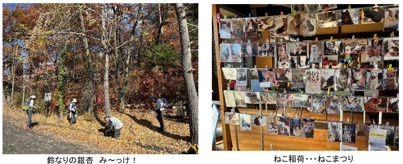 赤、黄、橙・・色とりどりに色づいた紅葉は見頃。鈴なりの銀杏を夢中で拾ったり、点在する神社仏閣で安全登山祈願をしながら歩いた。