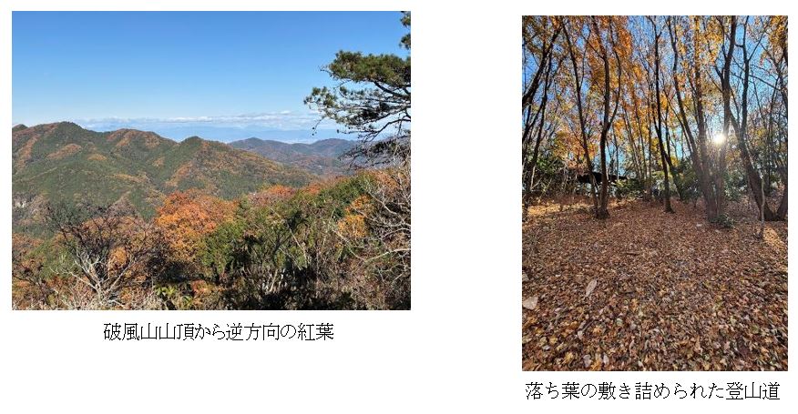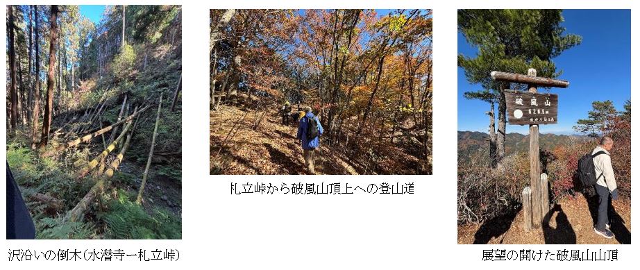 最初は杉林を抜け、沢沿いには倒木が多く見られた。登山道は次第に傾斜を増し、やがて稜線へ。ほどなく札立峠に着き、さらに15分ほどで破風山山頂に到達した。破風山の山頂は展望が素晴らしく、武甲山を中心に奥秩父の峰々、そして妙義山まで見渡せた。ただし残念ながら、富士山は雲に隠れたまま姿を見せてくれなかった。