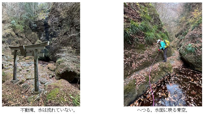 車道を歩き一軒家から沢に沿った登山道にに入る。晴天続きのため水流は少なめ。不動滝に到着。滝らしいが水は殆ど流れていない。鳥居がある。沢に沿って歩く。