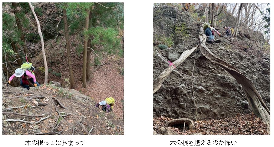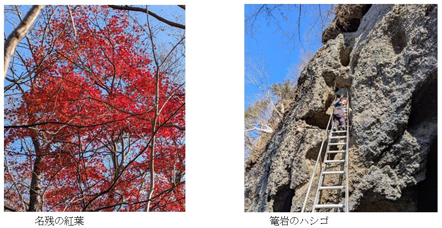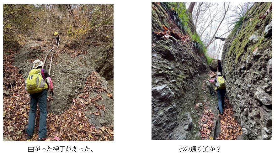 登山道に合流した時はホッとした。稜線に出ると、間もなく篭岩山に到着。何回かの急坂の下りと崖の登りがあって驚く。最後の崖を下ると普通の登山道になる。眼下には殆ど冬枯れした優しい色彩の風景が広がる。時々、綺麗な紅葉が残っている。