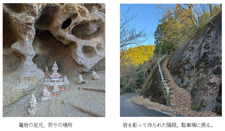 篭岩展望台に到着してから篭岩を探す。眼下に篭岩に登る梯子が見えた。梯子をちょっと登ってみた。自然が岩を穿ち穴だらけの岩。それが篭に似ているので篭岩と名付けたられたらしい。自然の造形の下には多くの仏像があった。祈りの場所かもしれない。