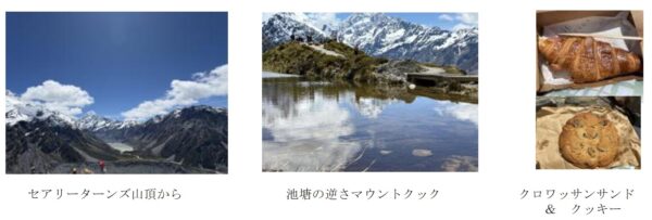 頂上は広く、皆が思い思いに写真を撮ったりランチタイムでのんびりしたりしている。目の前にはマウントクックが青空の下白く輝く。澄んだ水をたたえる池塘には逆さマウントクックが見られそう、でも風のいたずらか、水面のさざ波でぼやけていた。ホテルで用意してもらった クロワッサンサンドと大きなクッキーを美味しくいただき 下山する。