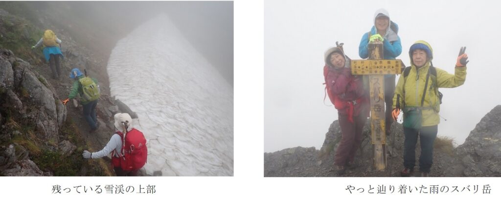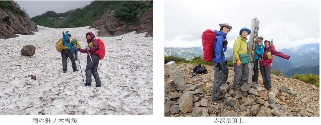 その頃は曇っていたけど間もなく小雨になった。念のため雨具を着ると結構な雨。雨の中大沢小屋経由針ノ木雪渓に到着。雨の中雪渓を登る。雪渓上には岩、木の枝等が多い。大きな岩のある所で山道に入りジグザク道を登り詰める。その頃には雨が止む。小屋に到着後に元気な二人が蓮華岳を往復。