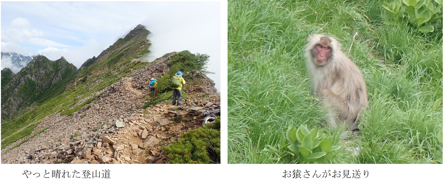 最終日、M落とK原が爺ケ岳を往復。その後朝食。柏原新道を歩きながら、前日に歩いた稜線を眺めて嬉しかった。満足しながら軽快に下山した。