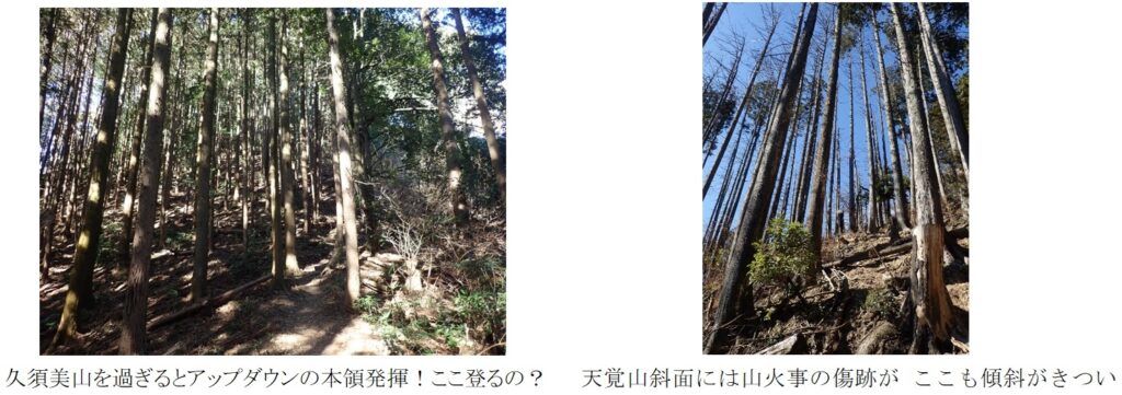 天覚山への登りがきつい。天覚山は2019年に火事があったそうで、その傷跡はまだ癒えていなかった。この先も展望無しのアップダウンが続くが、トレーニングと割り切って、黙々と登る。