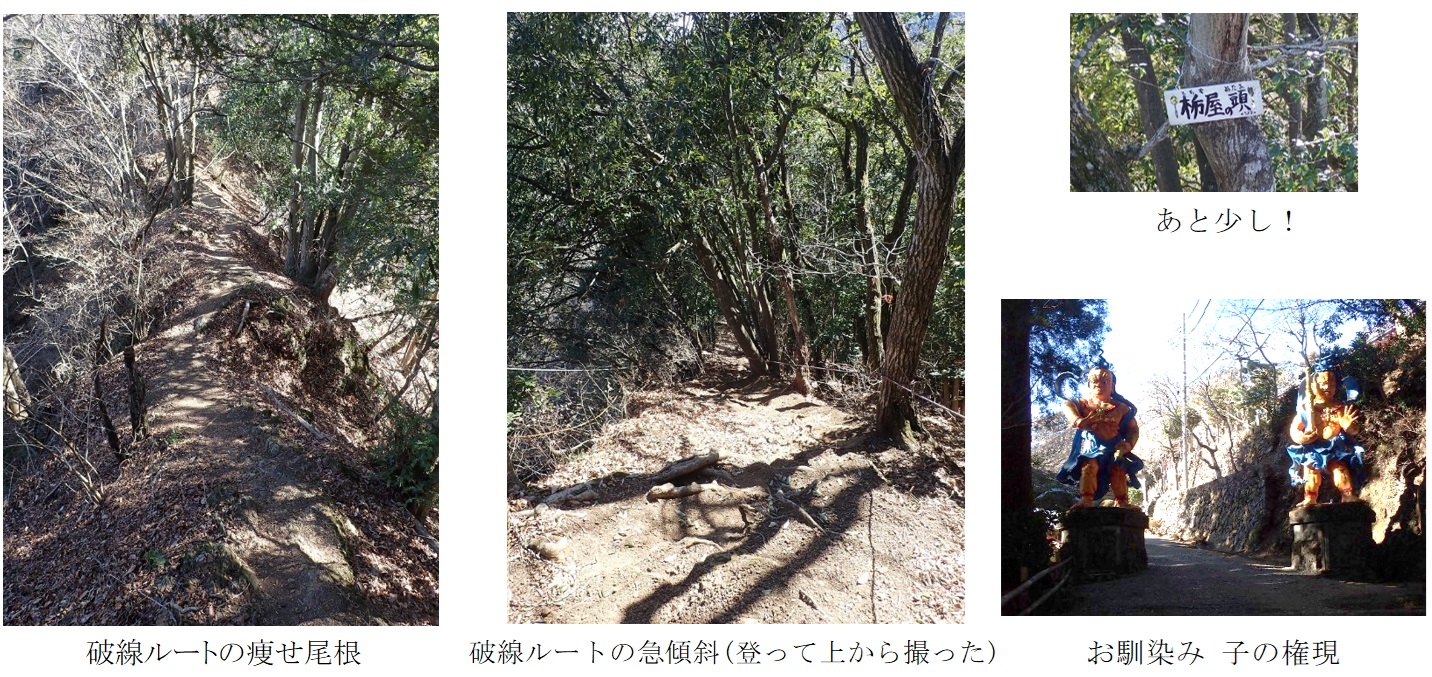 前坂~子の山は破線ルート。痩せ尾根や急傾斜、岩場などがあり、注意を要するが、慎重に進めば問題ないと感じた。手作りの看板もあり、人もそれなりに通っているようで、迷うことはなかった。