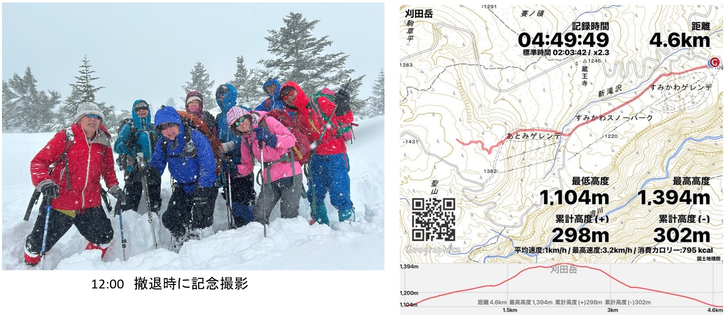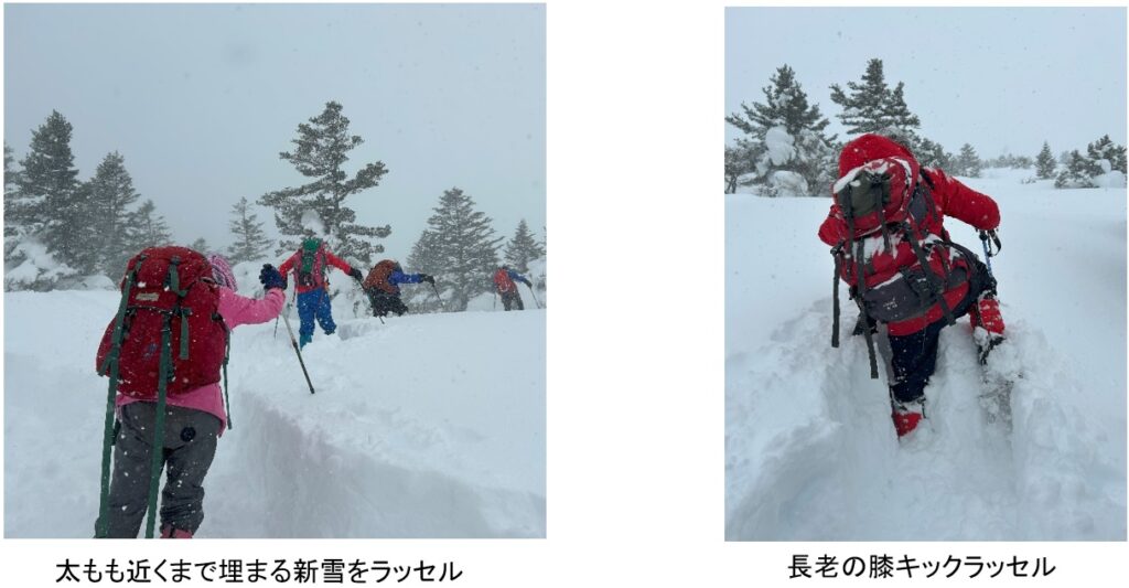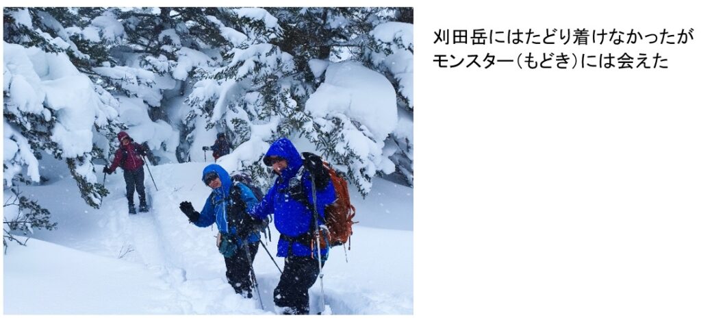 とはいえ、大雪のおかげで長老の膝キックラッセルを見ることもできた。スノーシューが外れ雪の中深くに埋もれてしまって、皆で必死に探し見付かった時の喜びはひとしお。ラッセルも含めてグループ山行のメリットを痛感する。