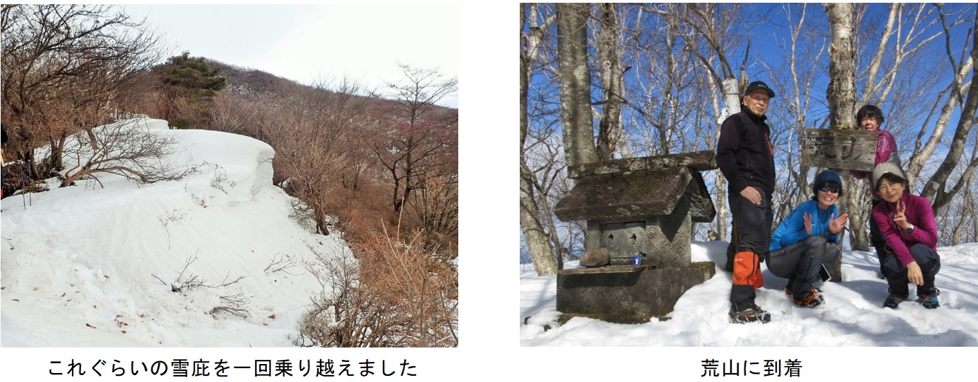 トレースはあるものの向かう人は多くはなさそうだ。途中、雪庇を乗り越える場面もあった。稜線上は日が当たるので、雪が溶けて土がドロドロな箇所があった。山頂直下の斜面で少し夏道を外れてしまったようだが、慎重に進み、荒山に到着。
