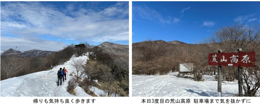 荒山高原までは北斜面なので積雪があり、所々地面が見える程度。高原が近づくと少し傾斜が急になり、暖かさも相まって体が熱くなる。高原に到着し、まずは荒山に向かう。