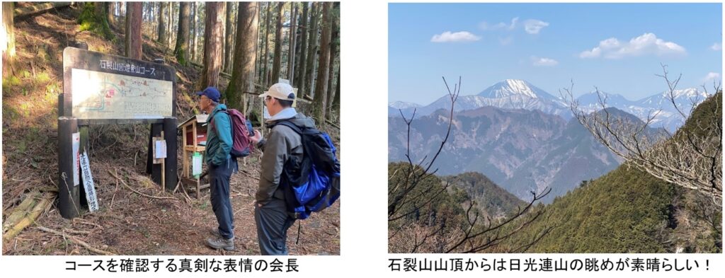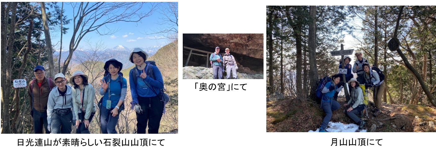 東剣ノ峰,西剣ノ峰をへて石裂山山頂(879m)へ。昼食をとり日光連山の眺めを堪能した。月山を経て下山開始。