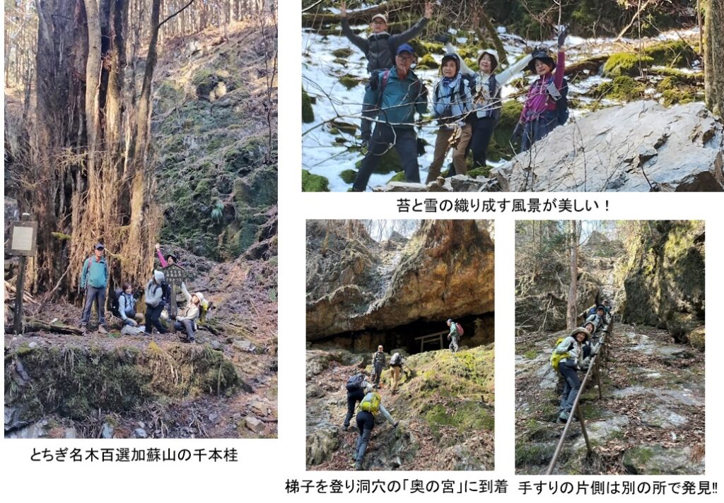 下りはかなりの急斜面で残雪と落ち葉が相まって滑り易かった。何とか無事下山したいと緊張し冷や汗が出た。険しい山ではあったが、良い経験が出来たし、変化に富んで楽しかった。最後に加蘇山神社に安全登山のお礼をし、天然温泉で汗を流し帰途に就いた。