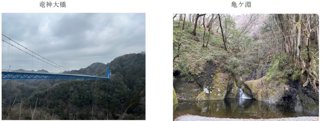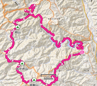 700竜神峡無料P→竜神ダム→亀ヶ淵→930亀ケ淵山→1100明山→おかめ山への分岐→P416→1330おかめ山1400→荷鞍山→林道コース赤岩集落→1530駐車場⇒帰柏