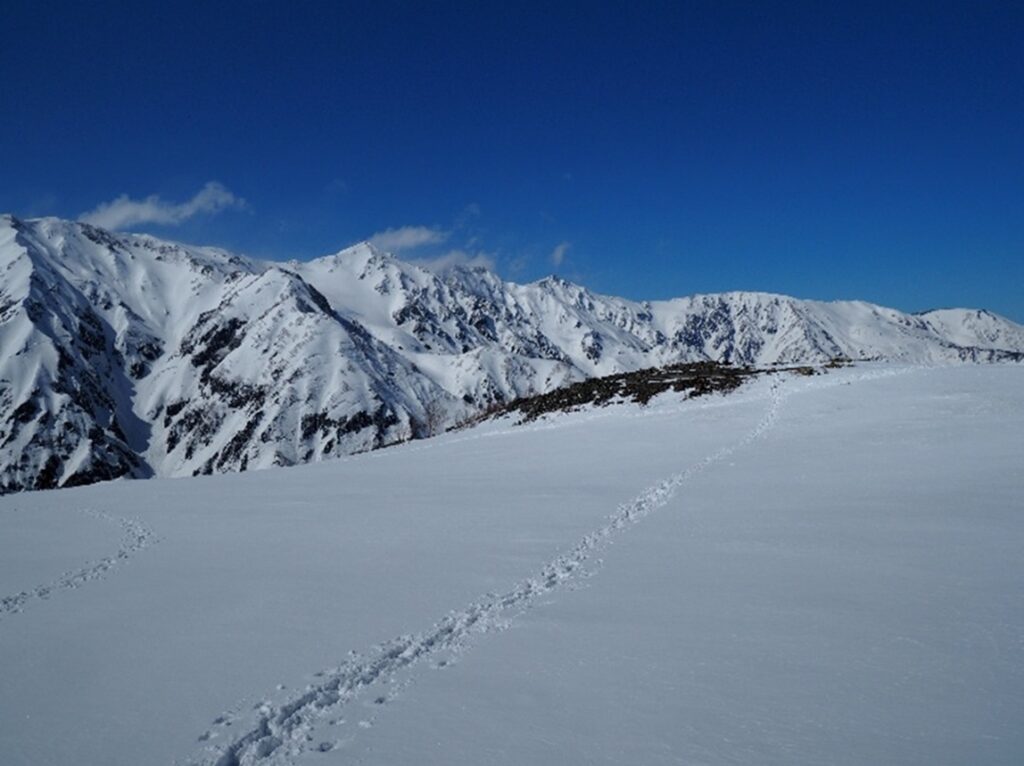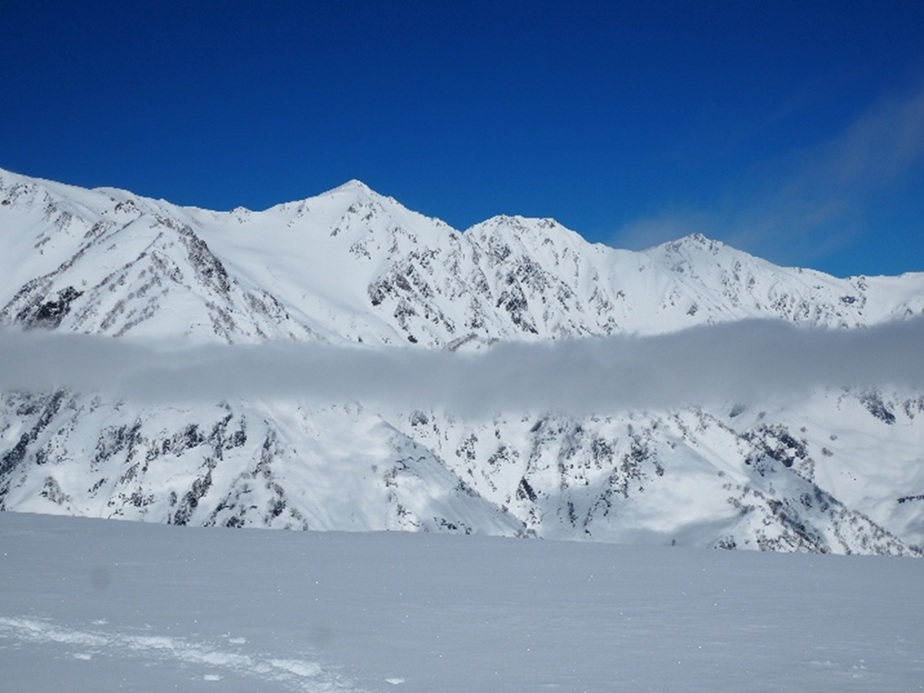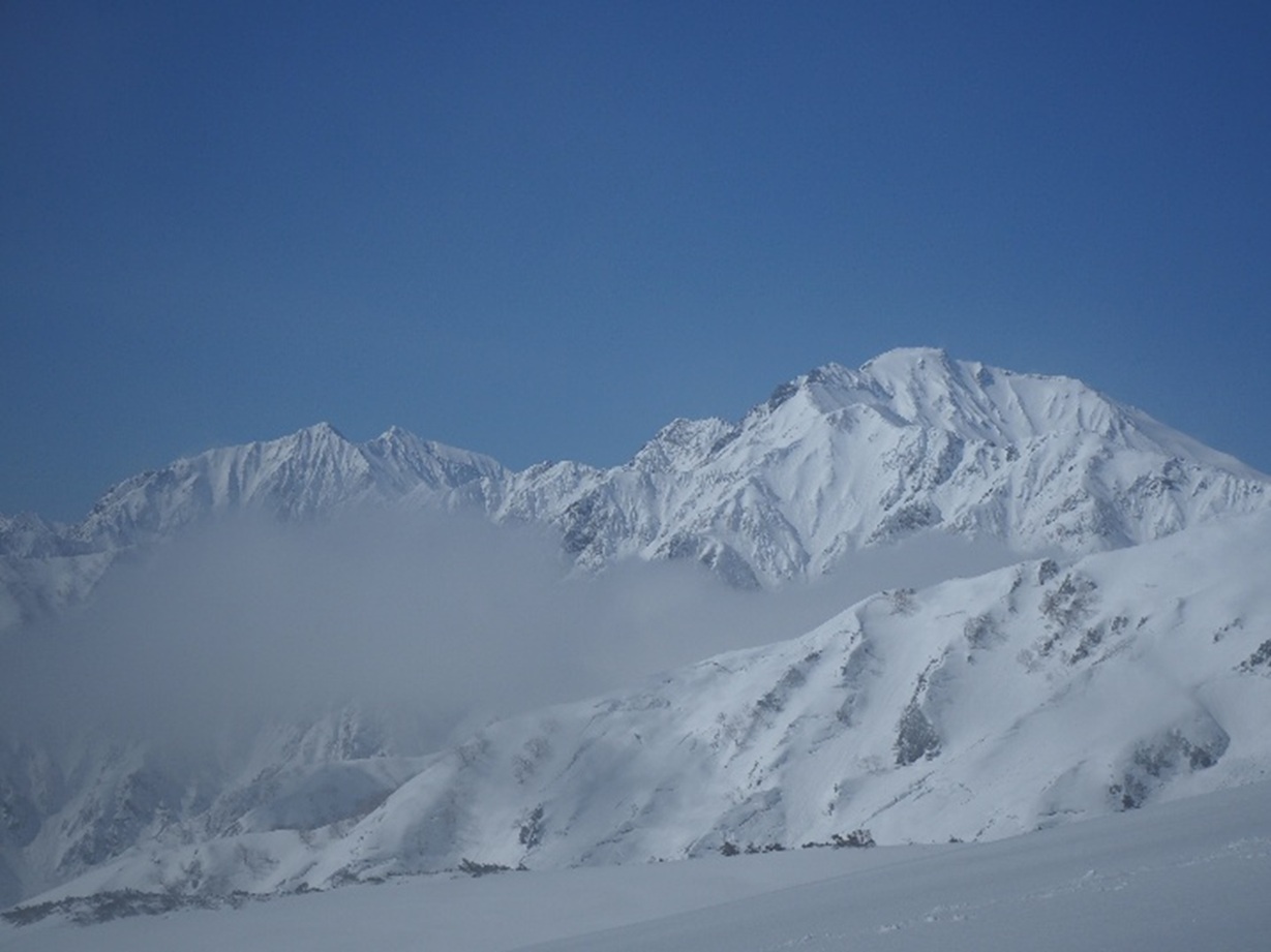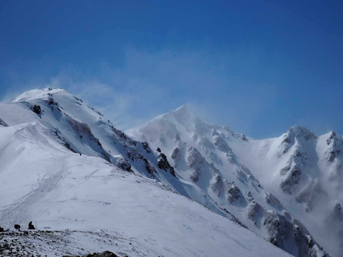 最後の急登にヘロヘロになりながら八方尾根最後のピークを踏んだ。目の前が開けたと同時に爆風が襲い掛かってきた。眼下には頂上山荘、向こうには立山連峰&剣岳。右手に唐松岳山頂。しかしあまりの爆風にこれ以上は無理だった。剣岳の写真すら撮るのを忘れるほどの爆風でした。