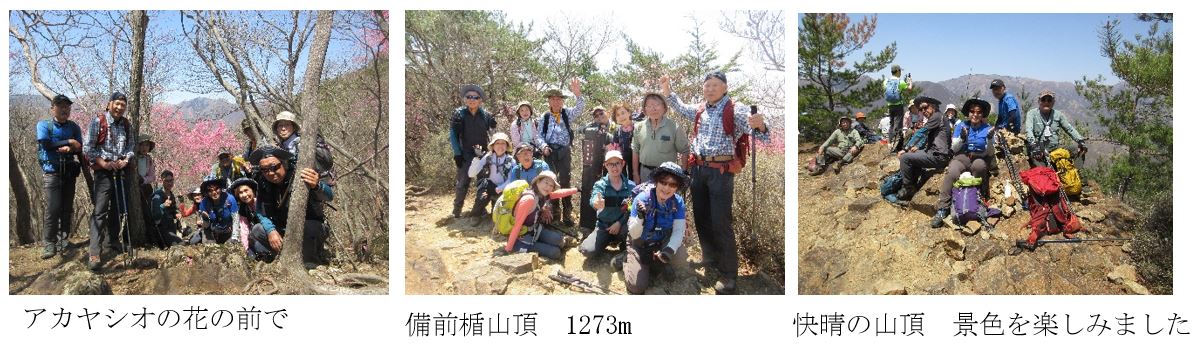 運よく舟石峠駐車場に入ることができ、準備をして備前楯山に登る。途中多くの登山者とすれ違う。花をつけただけのアカヤシオがきれいに咲いている。山頂より、足尾山塊、日光男体山など多くの山が眺められ素晴らしい景色である。狭い山頂で昼食、快晴で気持ちが良い。下山は約50分で駐車場に到着。