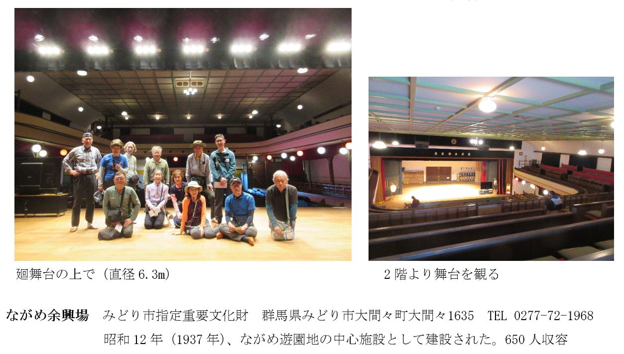 帰路途中銀山平キャンプ場に立寄り一休み、庚申ダムでダムカードをもらう。この先大間々までの渡良瀬川沿いのR122は新緑の中の快適なドライブとなった。大間々の「ながめ余興場」は、事前に見学の予約をしておいたので、係員が親切に対応してくれた。歴史ある余興場で地元の人々の保存活動により現在に至っているとのこと。見応えの有る建物であった。眼下には渡良瀬川と高津戸峡が見下ろされ良い景色である。そろそろ疲れてきたので柏に帰る。帰路の高速道路もほとんど渋滞せずに梅郷GSに着き、ここで清算、解散する。天気に恵まれ内容の多い計画で、参加者の方々は十分に楽しまれたと思います。
