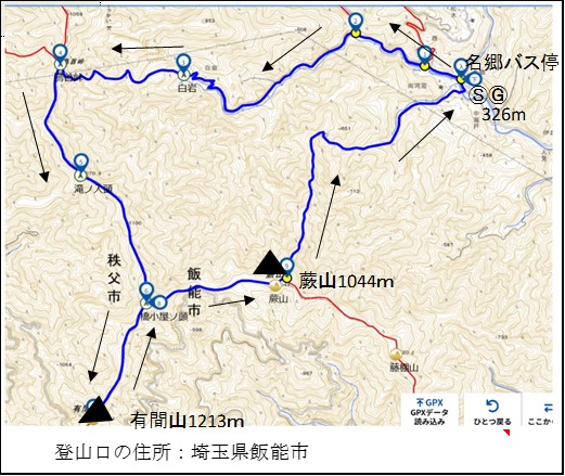 名郷バス停7:30→8:05白岩8:10→9:05鳥首峠9:20→10:05滝入ノ頭10:10→10:50橋小屋ノ頭11:00→11:40有間山(タタラノ頭)12:00→12:30橋小屋ノ頭12:35→13:20蕨山13:25→14:30屈曲点→15:20名郷バス停