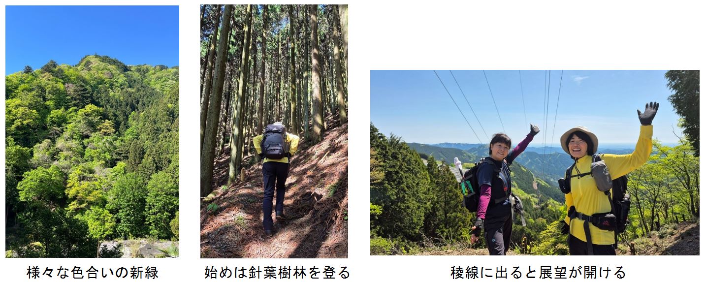 いよいよ登山道に入る。山肌には様々な色合いの新緑が映え、風は爽やかだ。針葉樹林の中を進み、急登を登りきると鳥首峠だ。ここからは稜線歩きとなる。広葉樹の新緑が目にやさしい。何か所か結構な急登を越えていくと、滝入ノ頭に着いた。有間山はいくつかのピークの連なりを指すようで、ここも有間山と言えるのかもしれない。この辺りから展望が開け、振り返ると両神山や大持山、武甲山などが見える。ミツバツツジも綺麗だ。