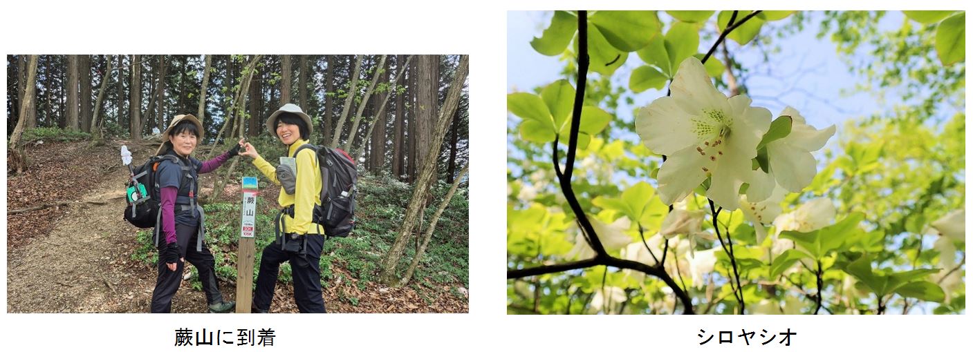 ここから蕨山へは最初急な下りだが、その後は歩きやすい道が続く。蕨山を過ぎて少し行くと、比較的急な岩場の下りが始まる。難しくはないが、滑落しないよう慎重に下る。緊張は続くがミツバツツジやシロヤシオに癒された。屈曲点を過ぎると針葉樹林の中を沢沿いに下る。2,3回渡渉すると林道に出る。前腿やふくらはぎに筋肉痛の予感を覚えながらも、気持ちのよい疲れと爽やかな風を感じながら歩き、名郷バス停に戻った。