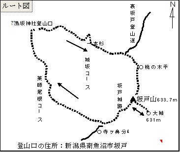 自宅発3:30⇒メンバー各所廻り⇒鳥坂神社登山口🄿7:45→坂戸山登山口8:00→坂戸山山頂9:33~10:12→小城10:15~10:19→大城10:19~10:26→小城10:15~10:19→大城10:19~10:26→小城10:26~10:32→坂戸山山頂10:33~10:47~坂戸山登山口11:48~11:53→鳥坂神社登山口🄿11:48~11:53⇒魚沼の里⇒新潟市内宿泊