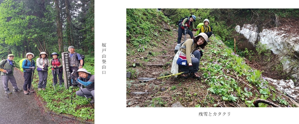 移動の車中は小雨も降る天気、予報通り曇天の空模様ながら行く先は晴れ間が垣間見えました。鬱蒼とした木々に囲まれた鳥坂神社駐車場から出発、城坂コースから上り、薬師尾根コース下る周回を歩きました。東京スカイツリーと同じ標高634m、かつては直江兼続の山城、坂戸城跡など歴史遺構も楽しめました。残雪時はカタクリ群生地とのコラボが人気の山で県内のみならず全国から登山者が訪れるそうです。関東では見られない大きな花弁のカタクリに感嘆の声もあがりました。目印にもなる一本杉、桃ノ木平を過ぎ登山道を大きく廻り込んで登った先が山頂、富士権現を祭ったお社があり、金城山、巻機山など新潟の名峰が望めました。更なる絶景を求め大城をピストン、ピンク色の満開のウツギの先に谷筋に雪を残す名峰が大きく望めました。下りの薬師尾根コースは階段や段差が大きく慎重さを要しましたが道端の愛らしい観音様群は地元に愛される山を物語っていました。眼下に広がる魚沼産コシヒカリの水田風景も癒しの美しさでした。シャガ、ウツギ、イチゲ、イワカガミなど沢山の花、猿とも遭遇した楽しい山行でした。帰路に「八海の里」へ寄り道、広い敷地内を散策、銘酒八海山の試飲、新潟名物へぎそばを頂き食の宝庫新潟も楽しむ事が出来ました。