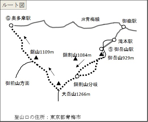 御岳山駅9:10→9:30御岳山(御岳神社)9:45→10:30奥の院峰10:40→10:55鍋割山11:05→11:50大岳山荘跡12:00→12:25大岳山13:00→14:10鋸山14:30→16:15愛宕神社16:25→16:45奥多摩駅