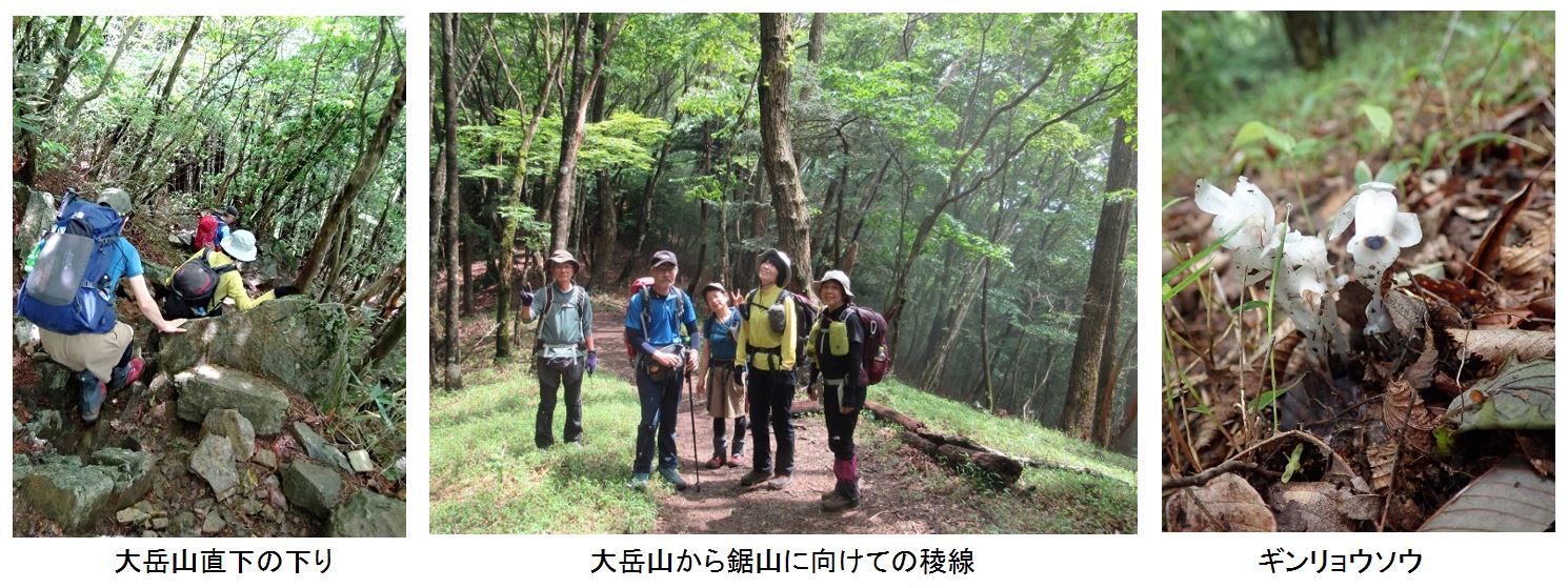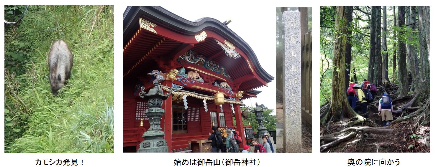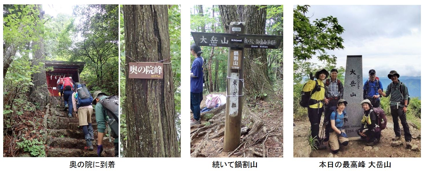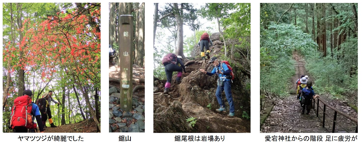まずは舗装路を歩き御岳山を目指すが、道中、カモシカを発見!最近出没しているらしい。階段を登りきると御岳山(御岳神社)に到着。本日の安全祈願をする。御岳山から大岳山に向けてはロックガーデンを通るルートが人気だが、今回は奥の院峰を通る稜線ルートを選択。人は少なく、杉の根が張り巡ぐらされた登りごたえのある道だ。その後、鍋割山を経由し、大岳山を目指す。鍋割山分岐より先は多少岩と鎖があるが、本日のメンバーなら全く問題ない程度だ。大岳山荘跡ではトイレが利用できた。山頂直下の岩っぽい所を登り切ると大岳山に到着。残念ながら富士山は見えなかったが、暑すぎない気候の中、一同ゆっくりとお腹を満たす。大岳山から鋸山は大岳山直下に少し急な下りがあるが、その後はヤマツツジの咲く快適な稜線が続く。鋸山が近づくと急な登りとなるが、力を振り絞り登頂。本日のコースはここからの下りが長く、岩場もあるので、一服してから出発。