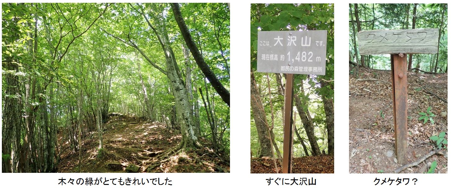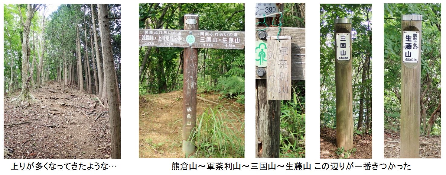 時刻表より少しだけ早くバスが都民の森に到着したので、早速歩き始める。順調に三頭山に到着。天気は良いのに富士山は見えなかった…。三頭山を過ぎると早速下り始める。道はよく整備されており、木々の緑も綺麗で「快適じゃん!」と先を急ぐ。このコース、所々で富士山が見えるらしいが、この日は終始姿を見せてくれなかったので、写真はピークの標識だらけになることをご了承いただきたい(笑)。浅間峠を過ぎた辺りから上り返しがきつく感じるようになる。長時間の歩行で足に疲労が溜まっていたようだ。熊倉山、三国山、生藤山辺りが一番きつかった…。