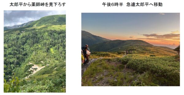 結果午後6時、全員がテントを撤収し、太郎平小屋まで移動、小屋前の広場でテントを張った。21時就寝。