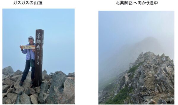 ガスが濃くなり、ヘッデンの明かりが役に立たず、2度ほどコースを間違えた。薬師岳に到着してもこのガスは取れずに、雄大なカールは見ることができなかった。そこから北薬師岳までは足場も悪く、ザックも重いため緊張を強いられた。