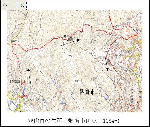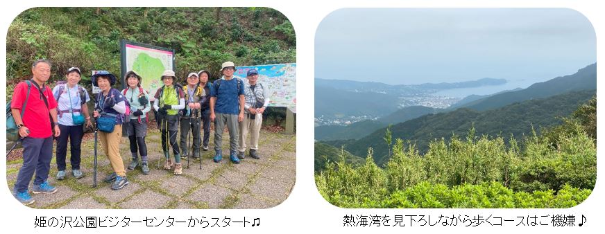 柏西口発5:30⇒熱海駅前🅿東海バス9:35⇒9:42→9:56姫の沢公園ビジターセンター10:04→11:13姫の沢公園展望台11:23→11:32日金山(十国峠)11:43→12:00東光寺12:06→12:39岩戸山13:02→14:58伊豆山神社15:13→伊豆山神社下15:30東海バス15:37⇒熱海駅前🅿16:00⇒貸別荘望洋閣17:30