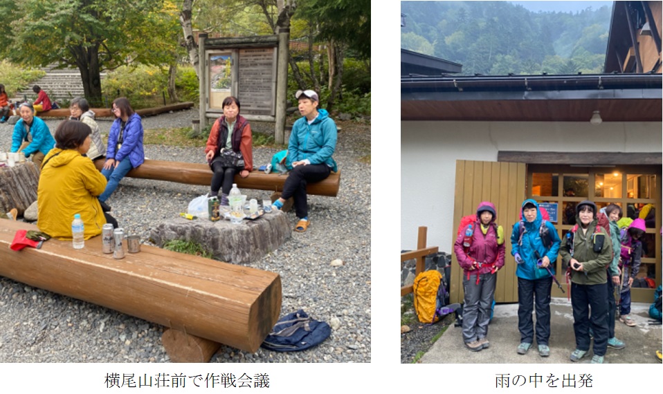 上高地から横尾山荘に向かう途中、涸沢から下山している人の話では、紅葉は見ごろであるとのことで、期待は高まる。