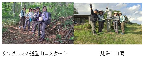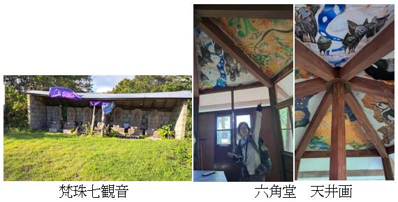 センターの方に六角堂の天井画とルートを勧められサワグルミの道登山口からスタート。足元には栗のイガ、とちの実が沢山落ちていて地元の方がとち餅を作ると拾っておられました。参道は整備されていて歩きやすく溝には板を渡してある。熊除けに笛を吹き進むと奈良県連の方が下山して来て熊がいたのかと驚かれていた。六角堂の天井画は青森県立美術館で描かれた作品でした。山頂には梵珠七観音が祀られ眼下には陸奥湾と津軽平野が一望の絶景でした。ブナの林、背の高い樹木が多く木漏れ日の中歩くことが出来ました。日没までに下山出来てホットしました。
