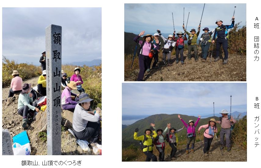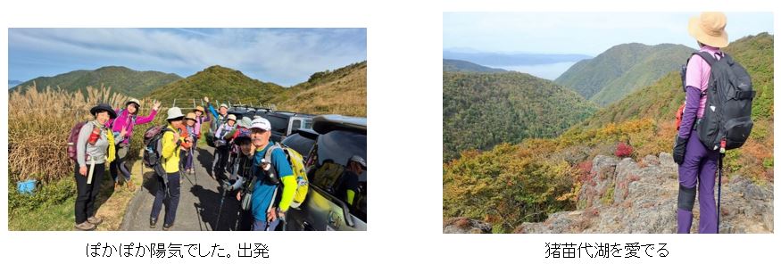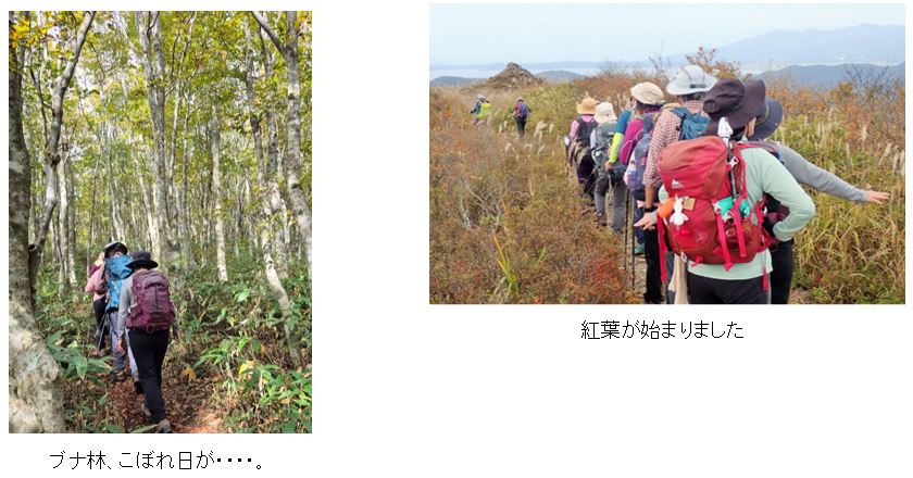 登山口をスタートすると景観もよく、東は郡山盆地、西は猪苗代湖が姿を見せてくれました。黒岩山の展望台を過ぎるとブナ林、ブナの木は白く根元には緑のササのじゅうたん、コントラストが最高でした。額取山迄の登山道は歩きやすく、アップダウン(標高差は少ない)を何度も繰り返しながらの登頂でした。磐梯山も姿を見せてくれました。13人を2班に分けての行動でしたが、お互いに声を掛け合いながら思いやりのある楽しい山行でした。