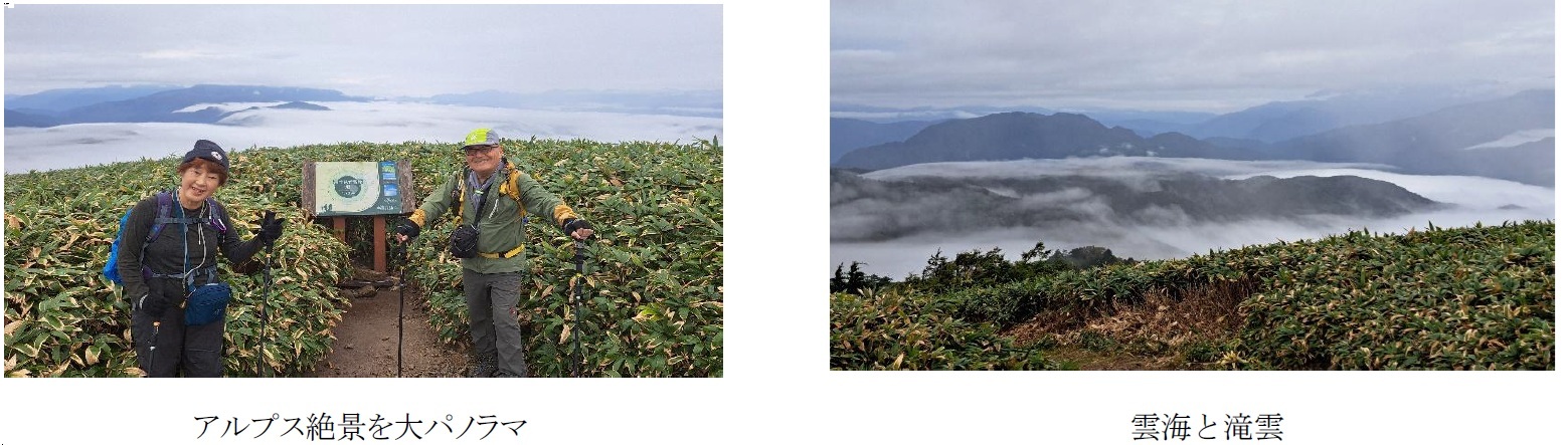 石段を登った先に笹原が広がります。昔は牛の放牧地だった歴史もあり穏やかな登山道から仲間が登っている大きな恵那山が望めます。神坂小屋へ寄り道、洒落た綺麗な避難小屋は別荘にしたい位の可愛らしさです。更に高度を上げて進み、富士見台高原へ着きました。左手には白山や荒島岳の山並み、右手には仙丈ヶ岳や間ノ岳の南北アルプスの名峰群と抜群の眺望でした。名峰の下にたなびく雲海、神秘的な滝雲と大パノラマの絶景を楽しみました。