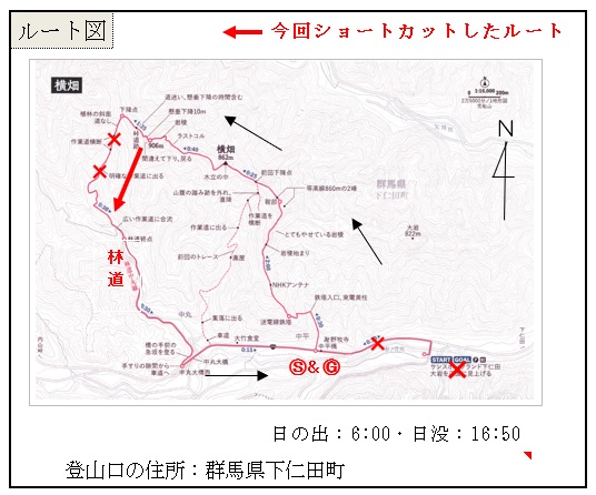 市役所駐車場3:40⇒4:50高坂SA⇒5:15下仁田IC⇒6:00野牧寺駐車場6:30→6:50鉄塔→7:10NHKアンテナ→7:40ヤセ尾根→8:50三等三角点 横畑→10:20 906峰→13:15林道終点→13:35中丸大橋西→13:55野牧寺駐車場14:10⇒15:00入浴(にこにこ甘楽)15:40⇒18:50市役所駐車場