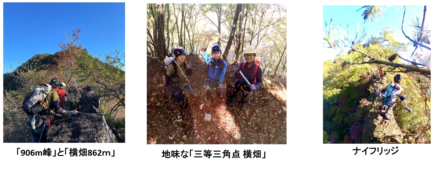 しばらく進み「三等三角点の横畑」の尾根に合流。岩場と疎林の尾根上で15m程の懸垂下降。三等三角点のある横畑に8:50に到着。三角点のみで表示物は無い。