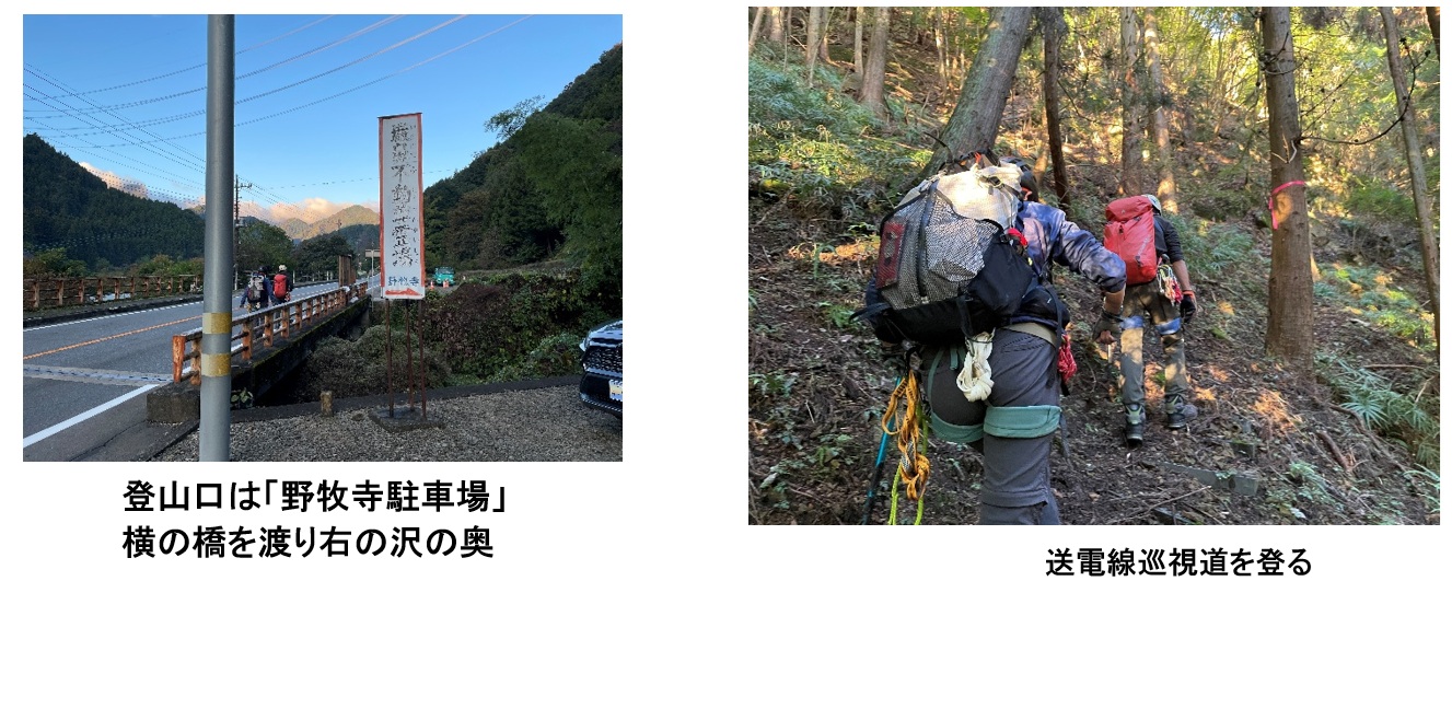 登山口から送電線巡視道で尾根に取付く。尾根上に上がり、鉄塔・NHKのアンテナを過ぎ岩稜を行くと両側が切れたナイフリッジに出た。歩くには狭い、跨ぐには広い岩尾根を緊張感をもって慎重に通過する。手掛かりの少ない岩場で岩にピッケルのピックをひっかけ登ろうとすると大岩がぐらりと動いた。ガイドで「浮石が多い」とあったが40~50cmを超える大岩が動いたのにはびっくり。