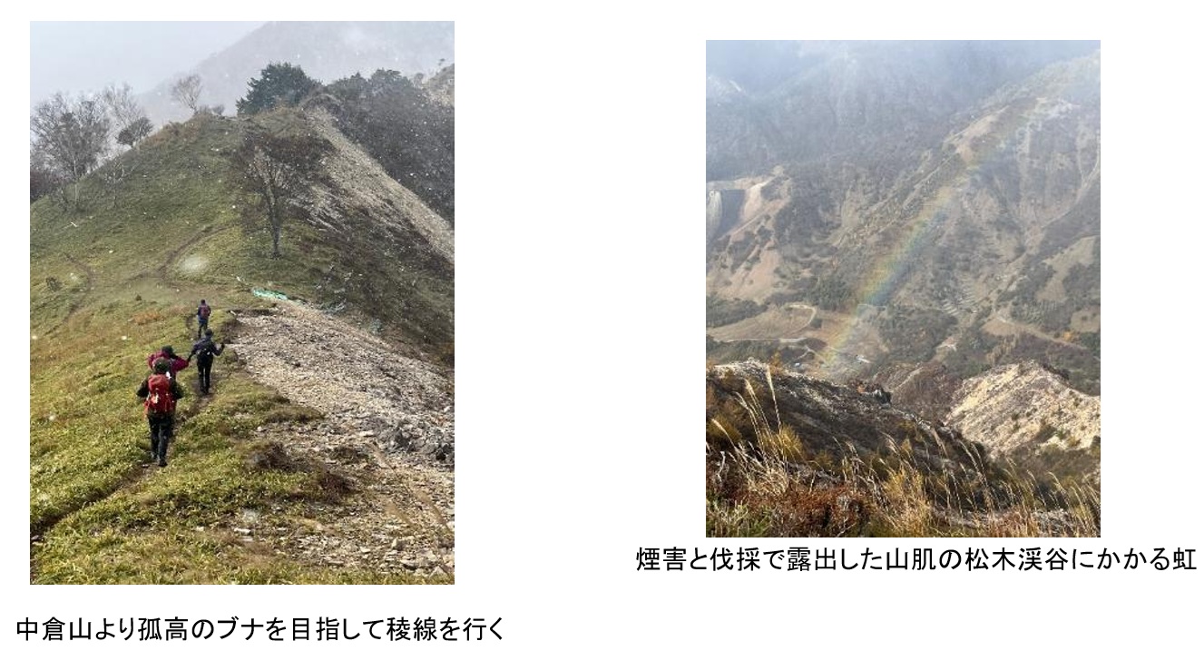 中倉山の山頂を経由して孤高のブナに行くルートを取り稜線に出るとものすごい強風で吹き飛ばされそうだった。雪も舞い視界は良くなかったが、松木渓谷の山肌に何んと虹が!雪と虹のコラボレーション!思ってもみなかった素敵な景色に一同大興奮だった。