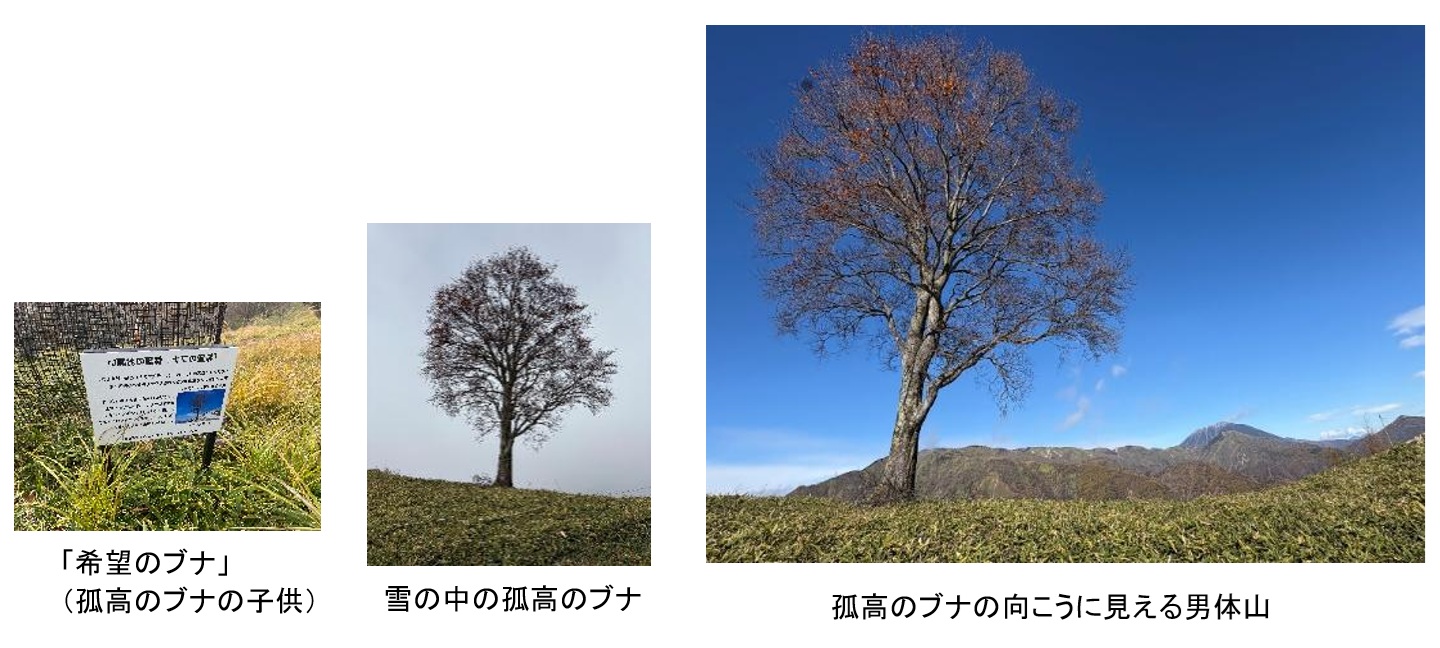 雪のため沢入山へは行かず孤高のブナで引き返すことに決定。横殴りに雪の粒が頬を打つ中、5分ほど稜線を歩くと憧れの孤高のブナに到着。自然保護のボランティアの方に聞いた孤高のブナの子供の「希望のブナ」も見つけることが出来た。