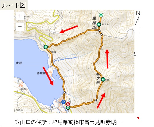 市営おのこ駐車場10:01→10:56駒ヶ岳11:15→12:03黒檜山(赤城山)頂上12:05→12:08絶景ポイント13:03→13:06黒檜山頂上13:14→14:19黒檜山登山口14:23→14:38市営おのこ駐車場