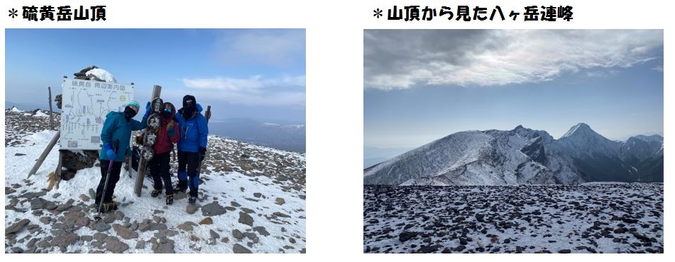 翌日は硫黄岳を目指し宿を後にした。夏沢峠からは想像通り風が強く尾根に出たころは時折立っていられないほどの爆風。何度か撤退が頭をよぎったが、何とか山頂にたどり着くと、眼前に赤岳、横岳等八ヶ岳連峰が待っていてくれた。本当に諦めなくてよかったと思った瞬間である。