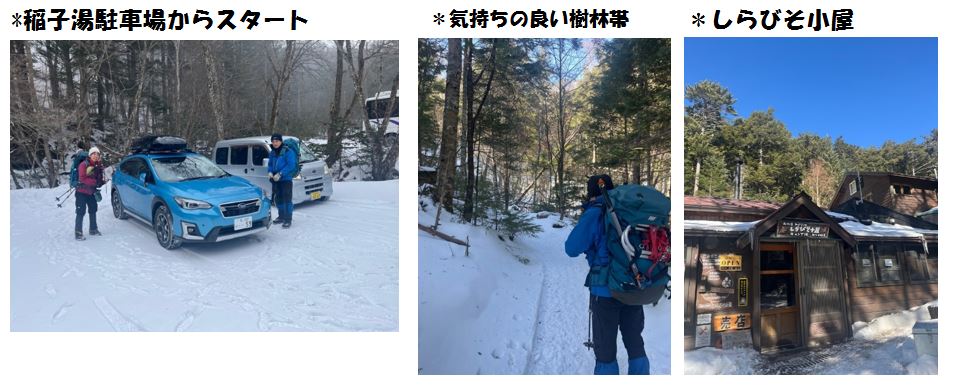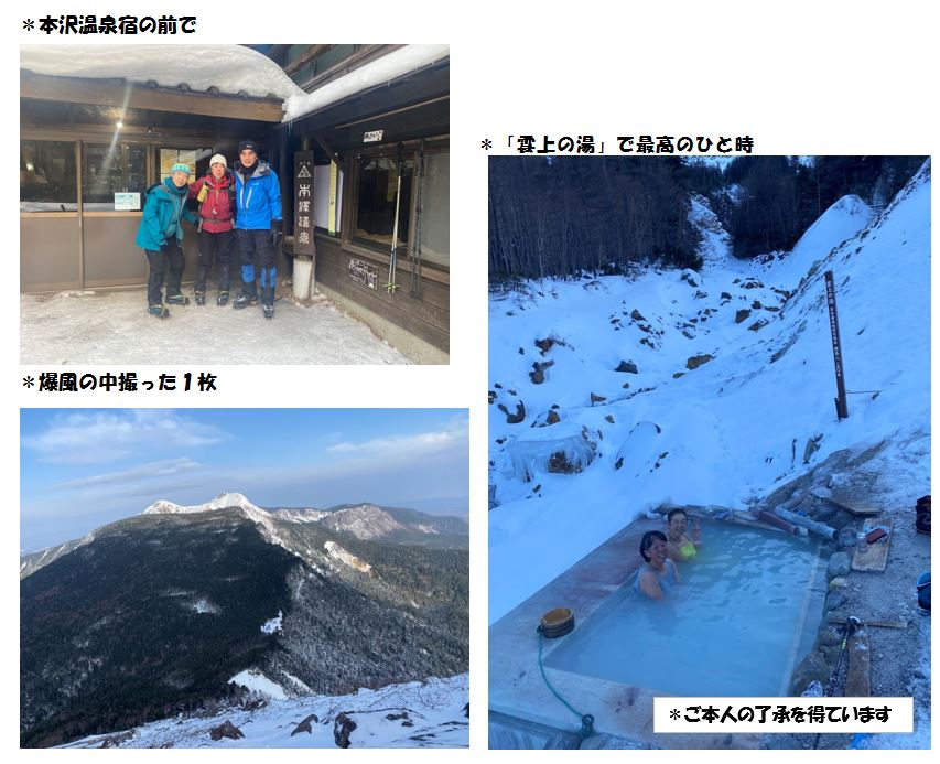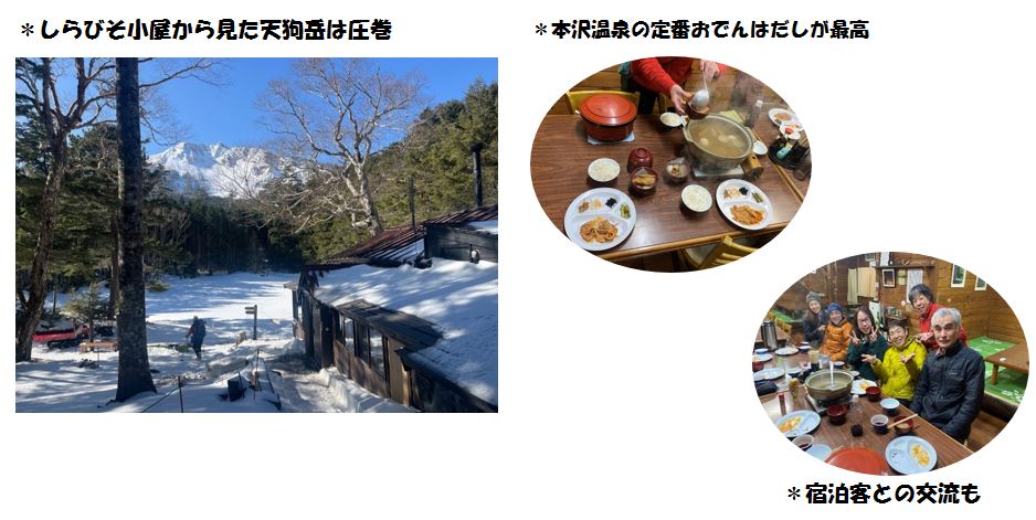 今回は標高2,150mにある本沢温泉の日本最高処野天風呂「雲上の湯」に入るのがメインイベント。絶好の山行日和で久しぶりに履いたアイゼンで雪道をスタート。気持ちの良い樹林帯を一歩一歩進みながらしらびそ小屋を目指す。みどり池は雪で埋もれて見えなかったが、目の前に大きな天狗岳が臨め先が楽しみになる。