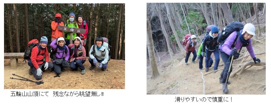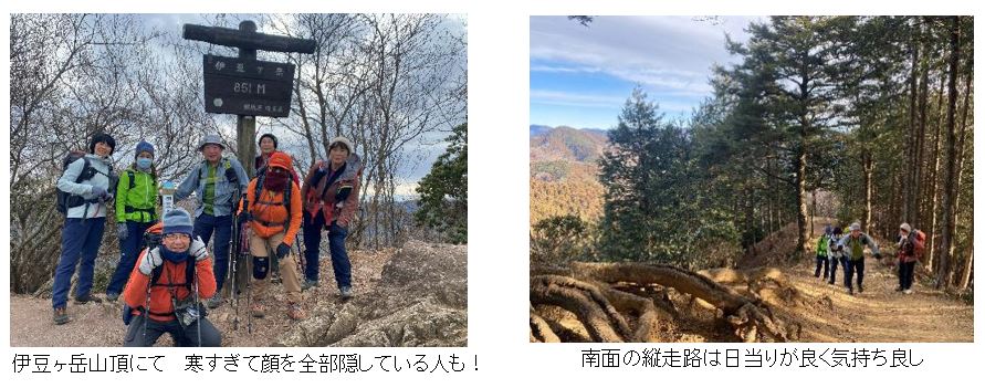 登山口からほどなく荒れた急登が続いてきつかったが、標高はどんどん稼ぐ事が出来た。北面の登山道に日差しはなく、登りが続くのに汗は出てこなかった。そのため衣服調整で次々と服を脱ぐメンバーの姿はなかった。支尾根道に出て視界が開けてほっとした。五輪山を経て閉鎖されたままの男坂を横目に見つつ、う回路で伊豆ヶ岳山頂へ。木立越しに奥武蔵の山々を見ることが出来た。
