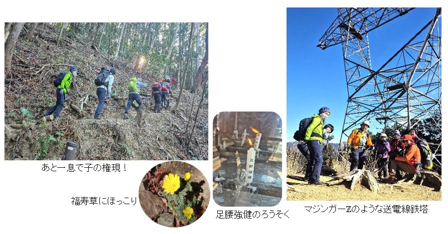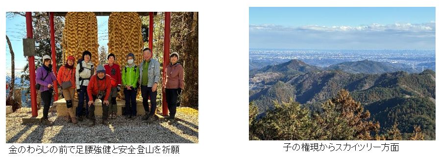 古御岳、高畑山とアップダウンを繰り返して天目指峠まで下りそこから登り返した。「おなか空いた!」の声が上がり途中の陽だまりで昼食を楽しんだ後、ようやく子の権現に到着。陽だまりに福寿草、白梅、紅梅、蝋梅が咲いており心が和んだ。足腰の神様にお参りし安全登山を願った。有名な金の巨大なわらじの前で記念撮影も出来て大満足し、子の権現から西吾野駅に向けて下山開始した。