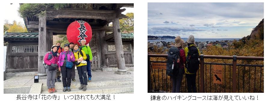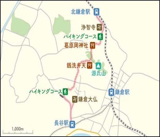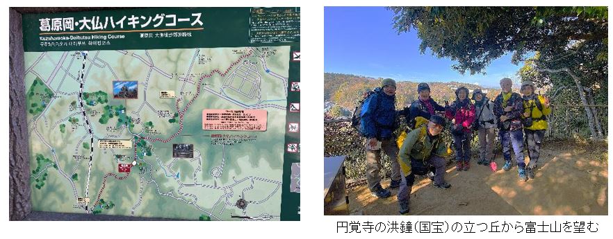 柏駅コンコース集合6:45⇒柏駅発6:57⇒品川7:54⇒北鎌倉着8:39→8:51円覚寺9:30→東慶寺→10:00浄智寺10:23→葛原岡ハイキングコース10:45→11:12葛原岡神社11:22→11:40源氏山公園(昼食・休憩)12:10→12:22銭洗弁財天12:42→大仏ハイキングコース→13:17大仏13:40→13:52長谷寺14:17→15:21鎌倉駅15:46⇒17:21帰柏駅