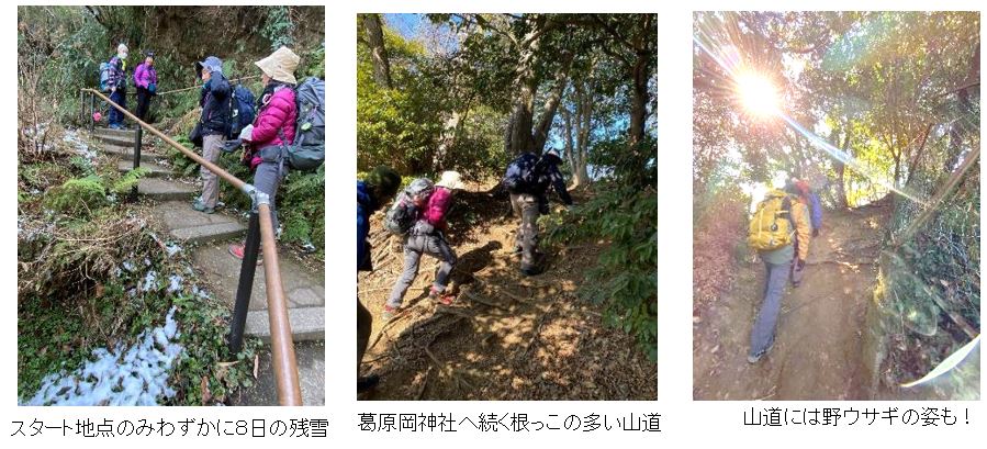 皆さんは残雪を心配して、登山靴で軽アイゼン持参だったが、良い意味で予想が外れてそれらの出番はなかった。雪は社寺の階段でもハイキングルートの山道でも完全に溶けていた。話は何転かしたが、今回はボランティアガイドさんなしで自分たちでハイキングコースを歩いた。